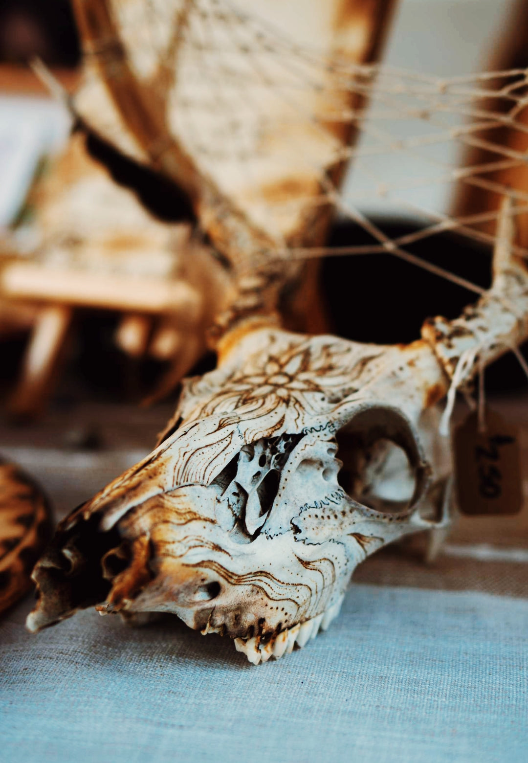 Ethically sourced animal skulls and bones adorned with art using pyrography techniques, as well as incorporating nature elements to surround it.